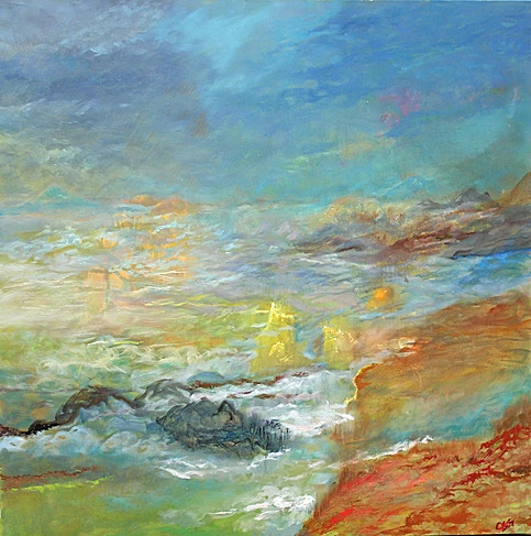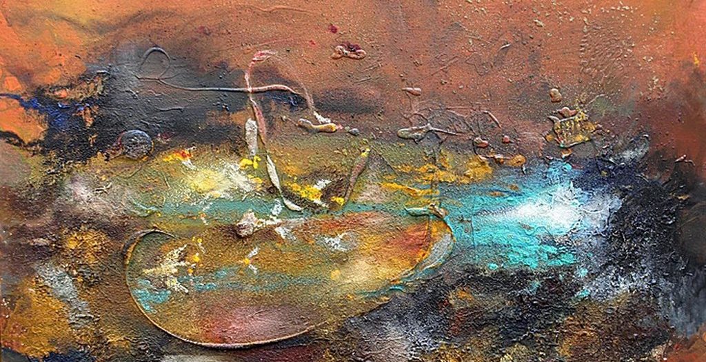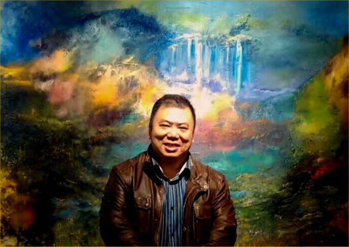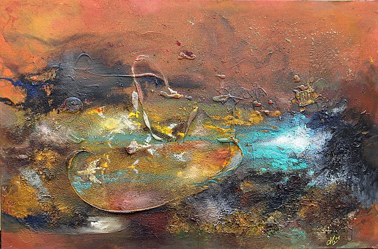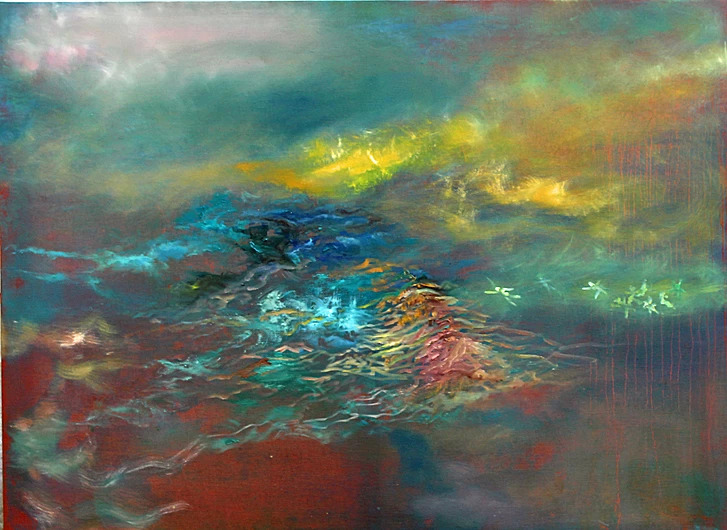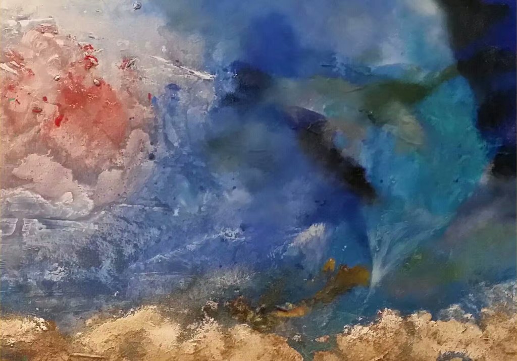 这就是他画作的特点: 即介于具象与抽象之间,解秘生命,自然,星河与人类之间缠结的神锁,画家把他的激情、思考、梦想都倾注在他的画布上。这里没有目标及主题,没有规则与设计,他给所有观众一个高度的个人化理解的空间。他所呈现的是似梦非梦,飘飘渺渺地宇宙之意境,这种意境所传达的是一种视觉感受,你完全可以用自己独特的理解、认知作为标准来欣赏这些画作,尤其是你感到触动心弦时,你会产生与画家的共鸣,由此与画家进行最深层次的情感交流。